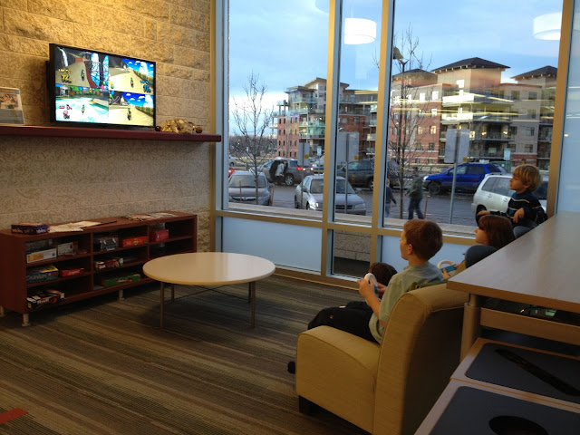 They had fun on the slide for a while and then we headed into toe library to dry off and warm up for a while. They played on the computers and on the Wii together and little K played on my iphone making cookies endlessly :) So very cute!!! :)